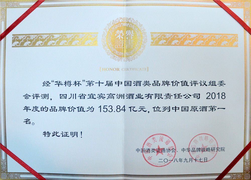 2018-公司經“華樽杯”第十屆中國酒類品牌價值評議組委會評測品牌價值為153.84億元,位列中國原酒第一名
